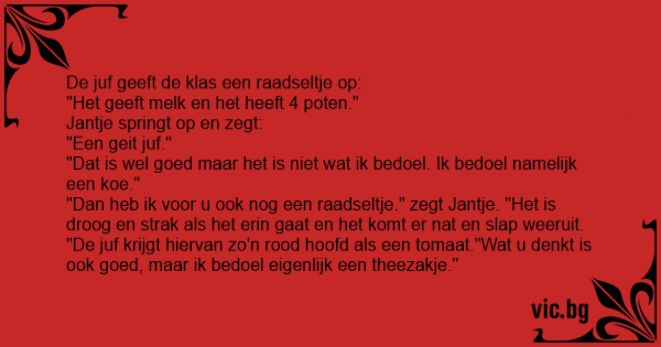 "Dan heb ik voor u ook nog een raadseltje." zegt Jantje. "Het is droog en strak als het erin gaat en het komt er nat en slap weeruit. "De juf krijgt hiervan zo'n rood hoofd als een tomaat."Wat u denkt is ook goed, maar ik bedoel eigenlijk een theezakje."
