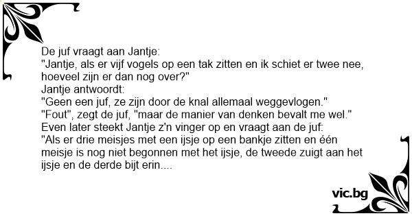 "Jantje, als er vijf vogels op een tak zitten en ik schiet er twee nee, hoeveel zijn er dan nog over?"