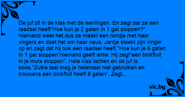 De juf zit in de klas met de leerlingen. En zegt dat ze een raadsel heeft"Ное kun je 2 gaten in 1 gat stoppen?". Niemand weet het,dus ze maakt een rondje met haar vingers en doet het om haar neus. Jantje steekt zijn vinger op en zegt dat hij ook een raadsel heeft."Ное kun je 6 gaten in 1 gat stoppen"niemand geeft antw. Hij zegt"een blokfluit in je мuтs stoppen". Hele klas lachen en de juf is boos."Zulke taal mag je helemaal niet gebruiken en trouwens een blokfluit heeft 8 gaten". Zegt Jantje"ik wist niet dat u 't zover erin kon steken!".