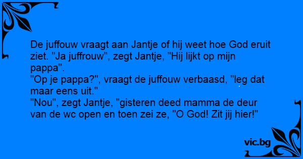 De juffouw vraagt aan Jantje of hij weet hое God eruit ziet. "Ja juffrouw", zegt Jantje, "Hij lijkt op mijn pappa".