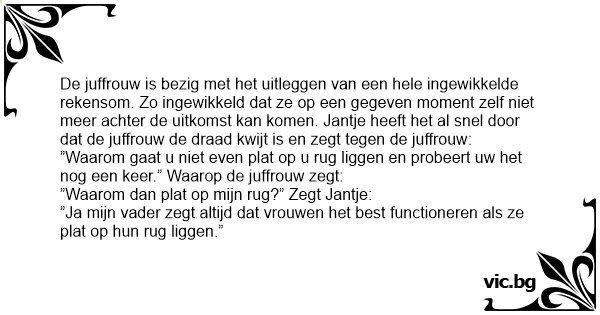 ”Waarom gaat u niet even plat op u rug liggen en probeert uw het nog een keer.” Waarop de juffrouw zegt: