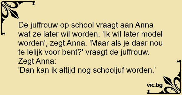 Juffrouw: ‘Lotte, wat wil jij later worden?’ Lotte: ‘Ik wil graag fotomodel worden.’ Juffrouw: ‘En wat als je later niet zo knap bent?’ Lotte: ‘Dan word ik juf!’