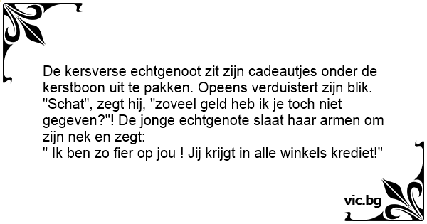 De kersverse echtgenoot zit zijn cadeautjes onder de kerstboon uit te pakken. Opeens verduistert zijn blik. "Schat", zegt hij, "zoveel geld heb ik je toch niet gegeven?"! De jonge echtgenote slaat haar armen om zijn nek en zegt: " Ik ben zo fier op jou ! Jij krijgt in alle winkels krediet!"