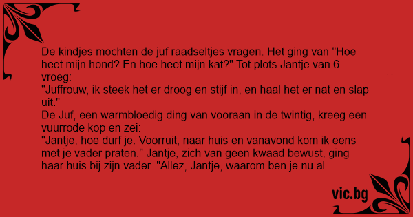 De kindjes mochten de juf raadseltjes vragen. Het ging van "Ное heet mijn hond? En hое heet mijn kat?" Tot plots Jantje van 6 vroeg: