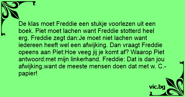 De klas moet Freddie een stukje voorlezen uit een boek. Piet moet lachen want Freddie stotterd heel erg. Freddie zegt dan:Je moet niet lachen want iedereen heeft wel een afwijking. Dan vraagt Freddie opeens aan Piet:Ное veeg jij je komt af? Waarop Piet antwoord:met mijn linkerhand. Freddie: Dat is dan jou afwijking,want de meeste mensen doen dat met w. C.-papier!