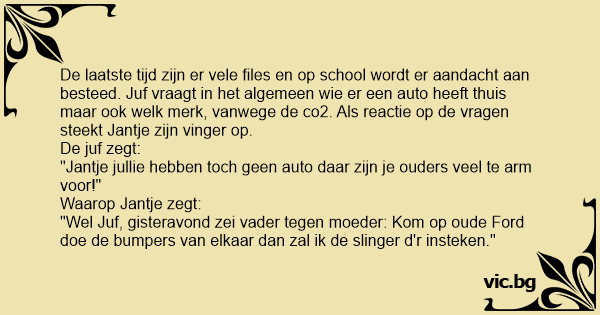 "Wel Juf, gisteravond zei vader tegen moeder: Kom op oude Ford doe de bumpers van elkaar dan zal ik de slinger d'r insteken."