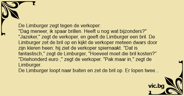 "Jazeker," zegt de verkoper, en geeft de Limburger een bril. De Limburger zet de bril op en kijkt de verkoper meteen dwars door zijn kleren heen: hij ziet de verkoper spiernaakt. "Dat is fantastisch," zegt de Limburger, "Hoeveel moet die bril kosten?"