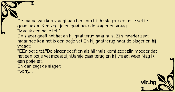 De mama van ken vraagt aan hem om bij de slager een potje vet te gaan halen. Ken zegt ja en gaat naar de slager en vraagt: