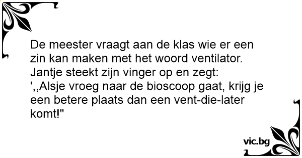 De meester vraagt aan de klas wie er een zin kan maken met het woord ventilator. Jantje steekt zijn vinger op en zegt: