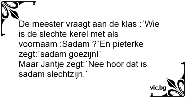 De meester vraagt aan de klas :´Wie is de slechte kerel met als voornaam :Sadam ?`En pieterke zegt:´sadam goezijn!`
