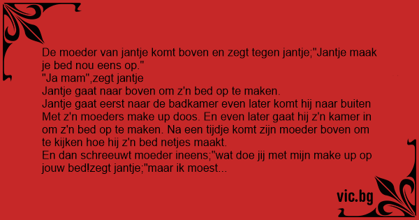 En dan schreeuwt moeder ineens;"wat doe jij met mijn make up op jouw bed!zegt jantje;"maar ik moest mijn bed toch op maken????!