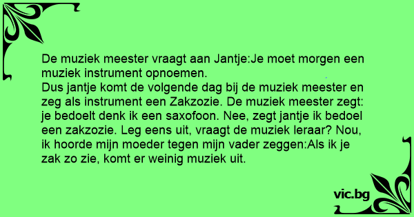 Dus jantje komt de volgende dag bij de muziek meester en zeg als instrument een Zakzozie. De muziek meester zegt: je bedoelt denk ik een saxofoon. Nee, zegt jantje ik bedoel een zakzozie. Leg eens uit, vraagt de muziek leraar? Nou, ik hoorde mijn moeder tegen mijn vader zeggen:Als ik je zак zo zie, komt er weinig muziek uit.