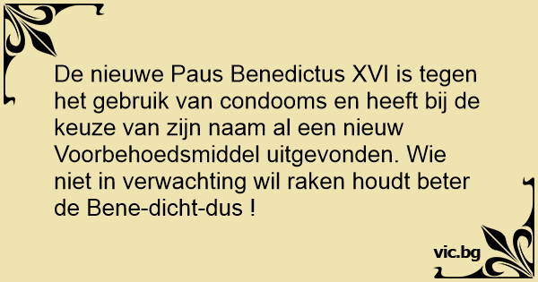 De nieuwe Paus Benedictus XVI is tegen het gebruik van condooms en heeft bij de keuze van zijn naam al een nieuw Voorbehoedsmiddel uitgevonden. Wie niet in verwachting wil raken houdt beter de Bene-dicht-dus !