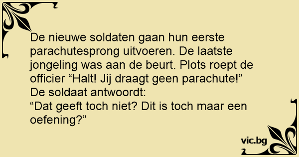 De nieuwe soldaten gaan hun eerste parachutesprong uitvoeren. De laatste jongeling was aan de beurt. Plots roept de officier “Halt! Jij draagt geen parachute!”