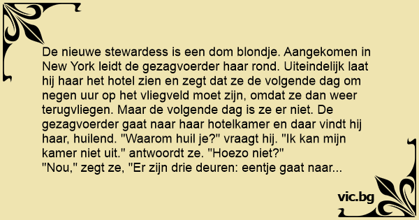 De nieuwe stewardess is een dom blondje. Aangekomen in New York leidt de gezagvoerder haar rond. Uiteindelijk laat hij haar het hotel zien en zegt dat ze de volgende dag om negen uur op het vliegveld moet zijn, omdat ze dan weer terugvliegen. Maar de volgende dag is ze er niet. De gezagvoerder gaat naar haar hotelkamer en daar vindt hij haar, huilend. "Waarom huil je?" vraagt hij. "Ik kan mijn kamer niet uit." antwoordt ze. "Hoezo niet?"