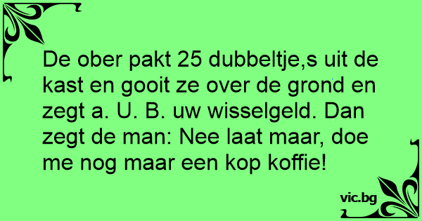 De ober pakt 25 dubbeltje,s uit de kast en gooit ze over de grond en zegt a. U. B. uw wisselgeld. Dan zegt de man: Nee laat maar, doe me nog maar een кор koffie!