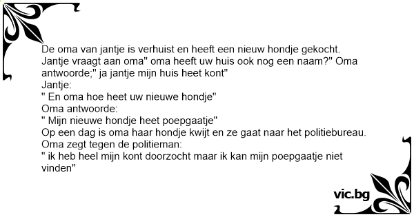 Jantje vraagt aan oma" oma heeft uw huis ook nog een naam?" Oma antwoorde;" ja jantje mijn huis heet kont"