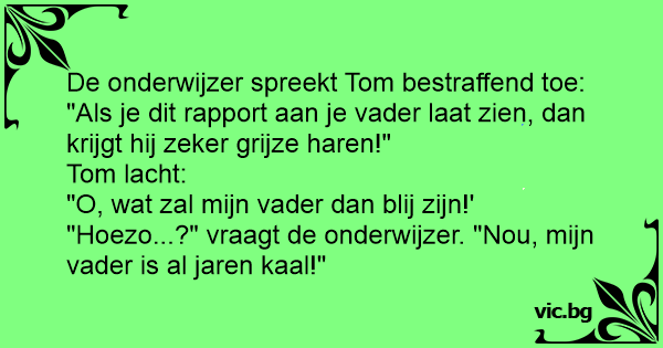 "O, wat zal mijn vader dan blij zijn!' "Hoezo...?" vraagt de onderwijzer. "Nou, mijn vader is al jaren kaal!"