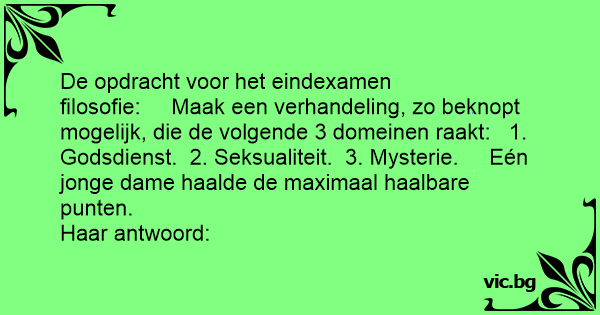 De opdracht voor het eindexamen filosofie: Maak een verhandeling, zo beknopt mogelijk, die de volgende 3 domeinen raakt: 1. Godsdienst. 2. Seksualiteit. 3. Mysterie. Eén jonge dame haalde de maximaal haalbare punten.