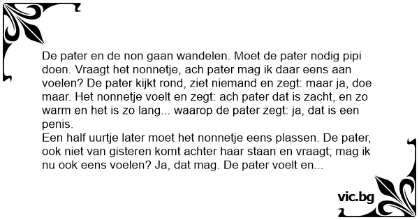 De pater en de non gaan wandelen. Moet de pater nodig pipi doen. Vraagt het nonnetje, ach pater mag ik daar eens aan voelen? De pater kijkt rond, ziet niemand en zegt: maar ja, doe maar. Het nonnetje voelt en zegt: ach pater dat is zacht, en zo warm en het is zo lang... waarop de pater zegt: ja, dat is een реnis.
