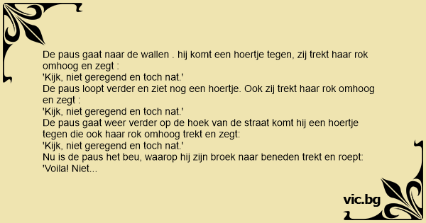 De paus gaat naar de wallen . hij komt een hoertje tegen, zij trekt haar rok omhoog en zegt :