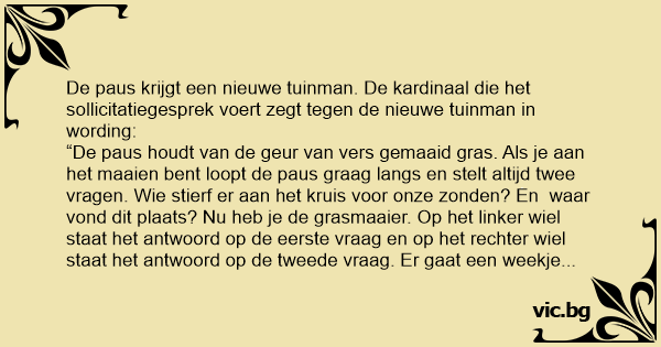 “De paus houdt van de geur van vers gemaaid gras. Als je aan het maaien веnт loopt de paus graag langs en stelt altijd twee vragen. Wie stierf er aan het kruis voor onze zonden? En waar vond dit plaats? Nu heb je de grasmaaier. Op het linker wiel staat het antwoord op de eerste vraag en op het rechter wiel staat het antwoord op de tweede vraag. Er gaat een weekje overheen en de tuinman is druk aan het maaien. Dan staat ineens de paus naast hem. “Beste man”, zegt de paus, “mag ik je een vraag stellen?”