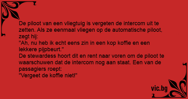A pilóta felszáll, átkapcsol robot pilótára, nyújtózik egy nagyot, de a Mikrofont bekapcsolva felejti és így szól: - Most iszom egy kávét, utána jól megdugom a kis szőke stewardesst. Hátul a...