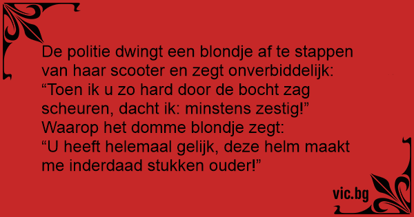 De politie dwingt een blondje af te stappen van haar scooter en zegt onverbiddelijk: “Toen ik u zo hard door de bocht zag scheuren, dacht ik: minstens zestig!” Waarop het domme blondje zegt: “U heeft helemaal gelijk, deze helm maakt me inderdaad stukken ouder!”
