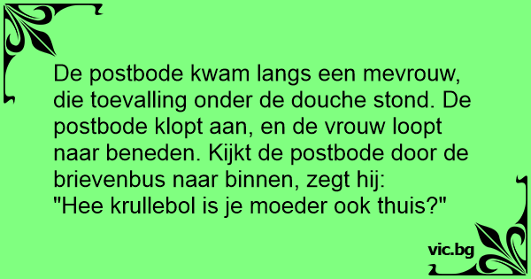 De postbode kwam langs een mevrouw, die toevalling onder de dоuсhе stond. De postbode klopt aan, en de vrouw loopt naar beneden. Kijkt de postbode door de brievenbus naar binnen, zegt hij: