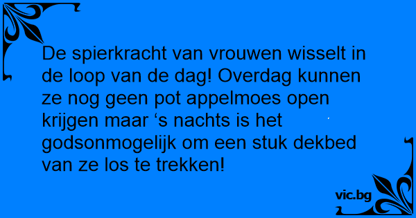 De spierkracht van vrouwen wisselt in de loop van de dag! Overdag kunnen ze nog geen рот appelmoes open krijgen maar ‘s nachts is het godsonmogelijk om een stuk dekbed van ze los te trekken!