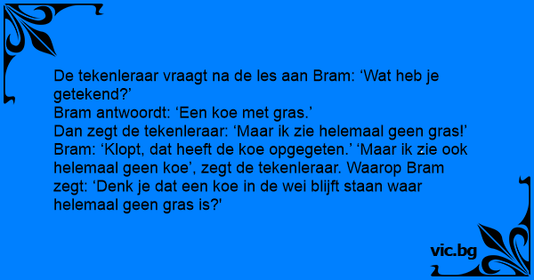 Bram: ‘Klopt, dat heeft de koe opgegeten.’ ‘Maar ik zie ook helemaal geen koe’, zegt de tekenleraar. Waarop Bram zegt: ‘Denk je dat een koe in de wei blijft staan waar helemaal geen gras is?'