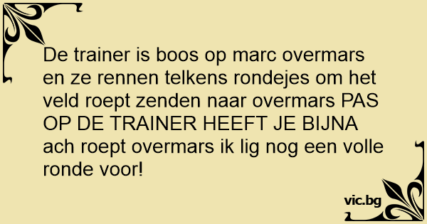 De trainer is boos op marc overmars en ze rennen telkens rondejes om het veld roept zenden naar overmars PAS OP DE TRAINER HEEFT JE BIJNA ach roept overmars ik lig nog een volle ronde voor!