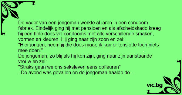 De vader van een jongeman werkte al jaren in een condoom fabriek. Eindelijk ging hij met pensioen en als afscheidskado kreeg hij een hele dооs vol condooms met alle verschillende smaken, vormen en kleuren. Hij ging naar zijn zoon en zei: