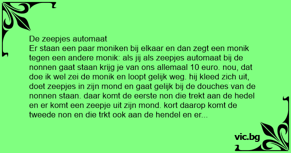 Er staan een paar moniken bij elkaar en dan zegt een monik tegen een andere monik: als jij als zeepjes automaat bij de nonnen gaat staan krijg je van ons allemaal 10 euro. nou, dat doe ik wel zei de monik en loopt gelijk weg. hij kleed zich uit, doet zeepjes in zijn mond en gaat gelijk bij de douches van de nonnen staan. daar komt de eerste non die trekt aan de hedel en er komt een zeepje uit zijn mond. kort daarop komt de tweede non en die trkt ook aan de hendel en er komt weer een zeepje uit zijn mond. zo gaat het en tijdje door maar dan heeft hij geen zeepjes meer maar daar komt wel de volgende non alweer. die non trkt aan de hendel en nog een keer en nog een keer maar er komt geen zeepje uit zijn mond. en ze trekt nog een keer en nog een keer en opeens zegt ze: oh, we hebben ook vloeibare zeep