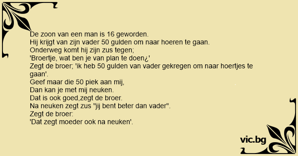 Zegt de broer; 'ik heb 50 gulden van vader gekregen om naar hoertjes te gaan'.