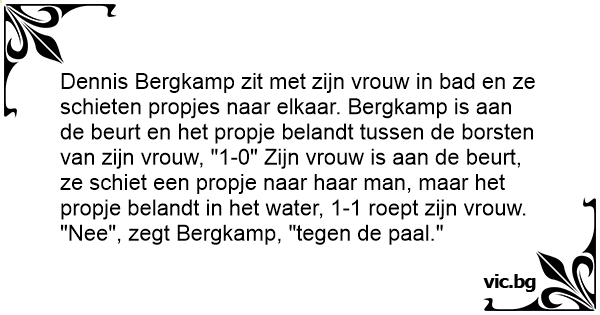 Dennis Bergkamp zit met zijn vrouw in bad en ze schieten propjes naar elkaar. Bergkamp is aan de beurt en het propje belandt tussen de borsten van zijn vrouw, "1-0" Zijn vrouw is aan de beurt, ze schiet een propje naar haar man, maar het propje belandt in het water, 1-1 roept zijn vrouw. "Nee", zegt Bergkamp, "tegen de paal."