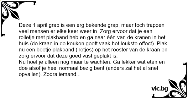 Deze 1 april grap is een erg bekende grap, maar toch trappen veel mensen er elke keer weer in. Zorg ervoor dat je een rolletje met plakband heb en ga naar één van de kranen in het huis (de kraan in de keuken geeft vaak het leukste effect). Plak nu een beetje plakband (netjes) op het rooster van de kraan en zorg ervoor dat deze goed vast geplakt is.
