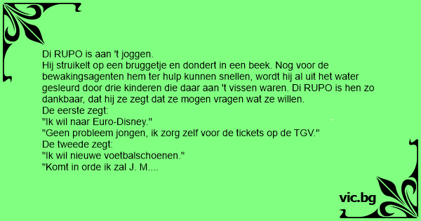 Hij struikelt op een bruggetje en dondert in een beek. Nog voor de bewakingsagenten hem ter hulp kunnen snellen, wordt hij al uit het water gesleurd door drie kinderen die daar aan 't vissen waren. Di RUPO is hen zo dankbaar, dat hij ze zegt dat ze mogen vragen wat ze willen.