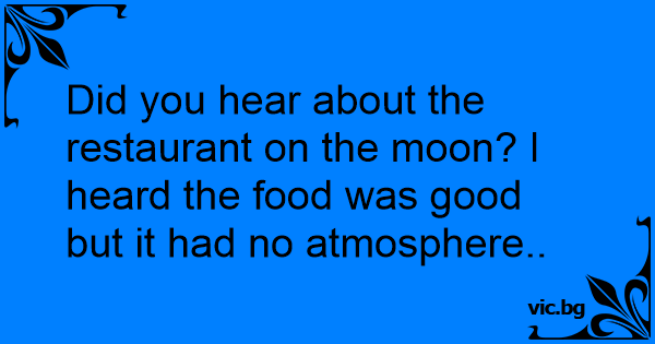 Did you hear about the restaurant on the moon? I heard the food was good but it had no atmosphere..