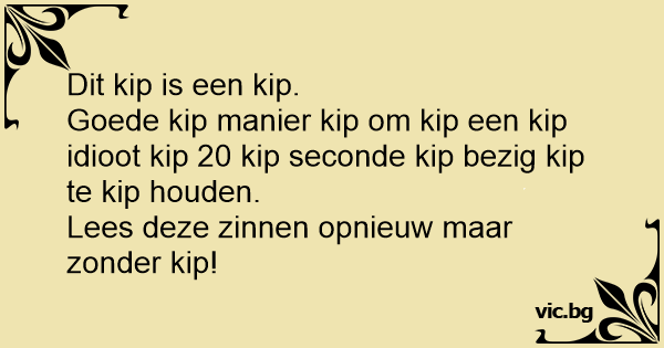 Dit kip is een kip.<br />Goede kip manier kip om kip een kip idiоот kip 20 kip seconde kip bezig kip te kip houden.<br />Lees deze zinnen opnieuw maar zonder kip!