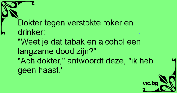 Dokter tegen verstokte roker en drinker:<br />"Weet je dat tabak en alcohol een langzame dood zijn?"<br />"Ach dokter," antwoordt deze, "ik heb geen haast."