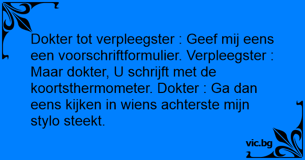 Dokter tot verpleegster : Geef mij eens een voorschriftformulier. Verpleegster : Maar dokter, U schrijft met de koortsthermometer. Dokter : Ga dan eens kijken in wiens achterste mijn stylo steekt.