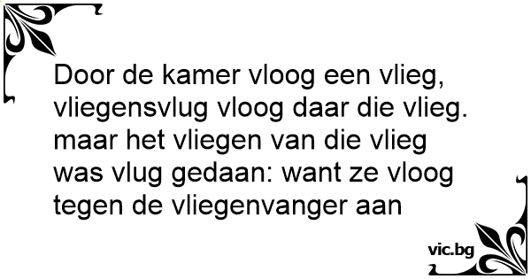 Door de kamer vloog een vlieg, vliegensvlug vloog daar die vlieg. maar het vliegen van die vlieg was vlug gedaan: want ze vloog tegen de vliegenvanger aan