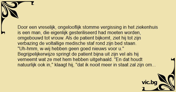 "Uh-hmm, w-wij hebben geen goed nieuws voor u." Begrijpelijkerwijze springt de patient bijna uit zijn vel als hij verneemt wat ze met hem hebben uitgehaald. "En dat houdt natuurlijk ook in," klaagt hij, "dat ik nooit meer in staat zal zijn om een erectie op te wekken!"