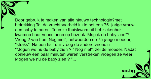 Door gebruik te maken van alle nieuwe technologie?met betrekking Tot de vruchtbaarheid lukte het een 75 -jarige vrouw een baby te baren. Toen ze thuiskwam uit het ziekenhuis kwamen haar vriendinnen op bezoek. Mag ik de baby zien"? Vroeg ? van hen. Nog niet", antwoordde de 75-jarige moeder, "straks". Na een half uur vroeg de andere vriendin :