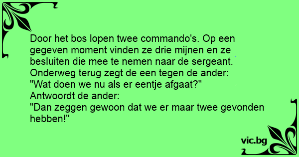 Door het bos lopen twee commando's. Op een gegeven moment vinden ze drie mijnen en ze besluiten die mee te nemen naar de sergeant. Onderweg terug zegt de een tegen de ander: