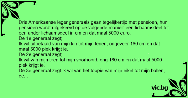 Az USA hadserege nyugdíjba vonulása alkalmából három tábornokot kíván megjutalmazni. Arra kérik őket, hogy adjanak meg tetszőlegesen két testrész között egy távolságot, azt lemérik és...