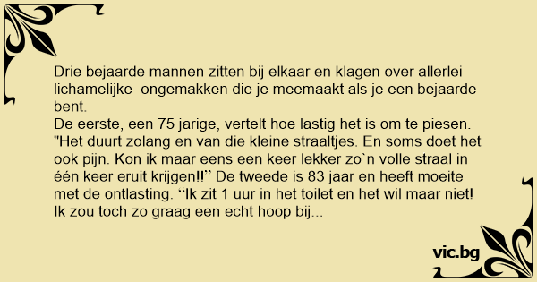 Drie bejaarde mannen zitten bij elkaar en klagen over allerlei lichamelijke ongemakken die je meemaakt als je een bejaarde веnт.