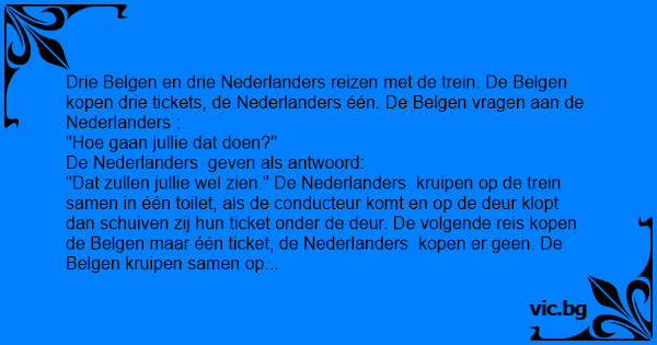 "Dat zullen jullie wel zien." De Nederlanders kruipen op de trein samen in één toilet, als de conducteur komt en op de deur klopt dan schuiven zij hun ticket onder de deur. De volgende reis kopen de Belgen maar één ticket, de Nederlanders kopen er geen. De Belgen kruipen samen op het toilet als de trein vertrekt, de Nederlanders kloppen op de deur van hun toilet en nemen het ticket van de Belgen en gaan dan samen naar hun toilet.