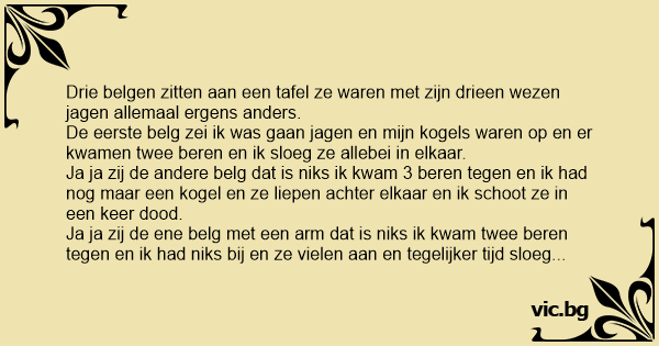 De eerste belg zei ik was gaan jagen en mijn kogels waren op en er kwamen twee beren en ik sloeg ze allebei in elkaar.